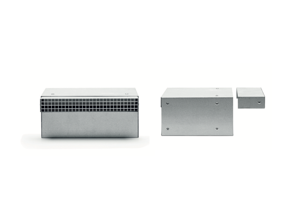Ljuddämpande rektangulär kanal med integrerat galler för dolt luftintag.